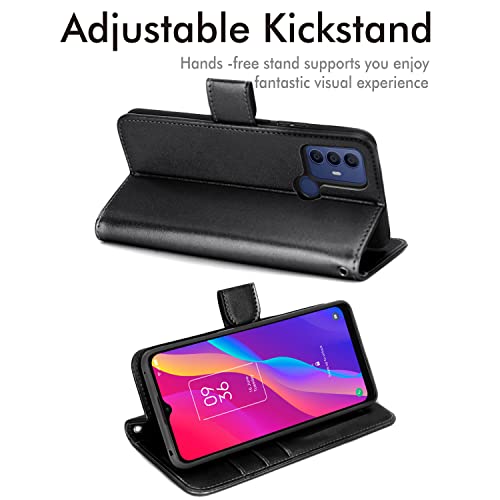 TECHGEAR Custodia in Pelle TCL 306, Cover Libro Protettiva con Slot per Schede, Supporto e Cinturino da Polso - Pelle Sintetica per TCL 306 Cover Portafoglio (Nero)