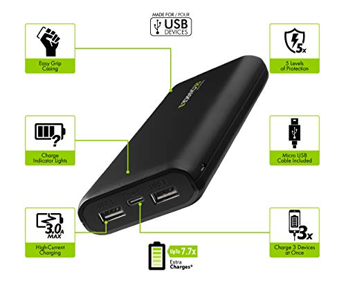 Potente quando più ne avete bisogno di ricarica - 12,000 mAh Li-Ion batteria si carica uno smartphone fino a 7.7 x e utilizza l' ultima tecnologia di ricarica rapida, consentendo super-veloce ricarica del dispositivo e offre fino a 3 A di uscita totale