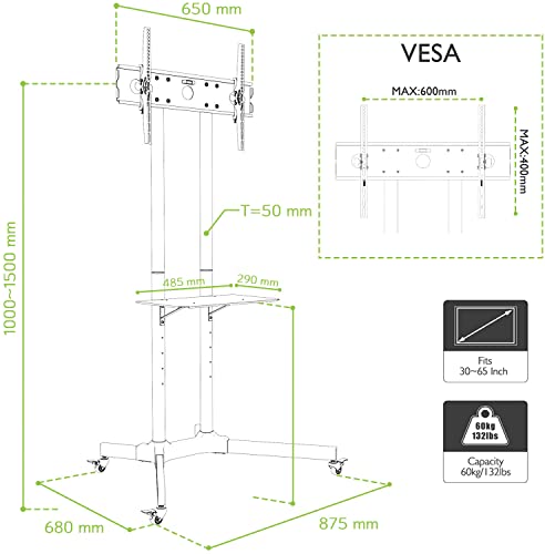 ✅ Carrello per TV LED/LCD da 30"-65" con portata massima di 60 kg;