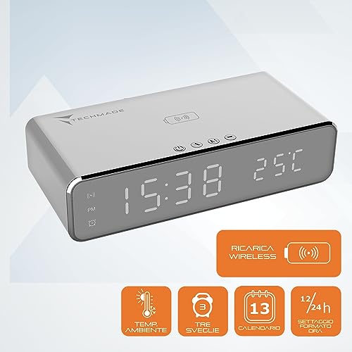 TECHMADE Sveglia Digitale con Ricarica Wireless, Sveglia con Allarme con Timer, Display LED Regolabile Luce notturna, Ricarica per iPhone, Samsung, Huawei e Altri (SILVER)