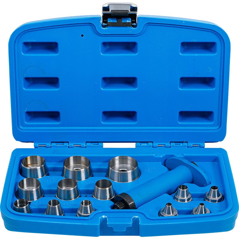 SET 14 PEZZI, FUSTELLE E PUNZONE - 13 punzoni intercambiabili 5 - 6-8 -10-11-13-16-19-22-25-28-32-35mm - 1 portapunzone a cambio rapido con design ergonomico della maniglia e punzone centrale a molla - Adatto per carta, fogli di plastica e gomma