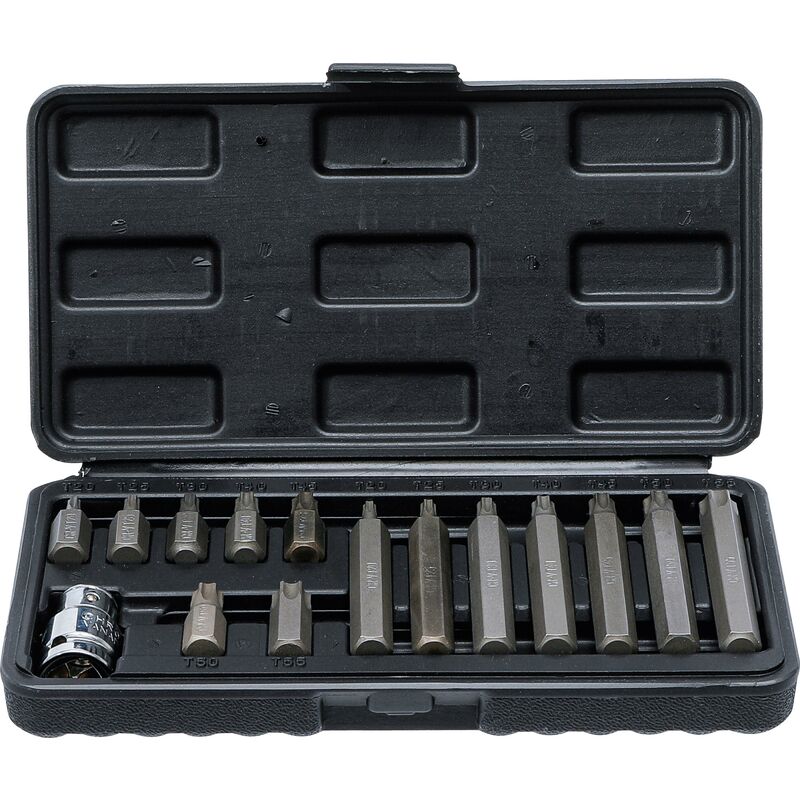 Oggetto della fornitura: Inserti speciali, corti, profilo a T (per Torx) T20 - T25 - T30 - T40 - T45 - T50 - T55 Inserti speciali, lunghi, profilo a T (per Torx) T20 - T25 - T30 - T40 - T45 - T50 - T55 Adattatore, attacco 12,5 mm (1/2) Materiale Acciaio al cromo-vanadio