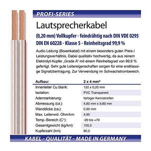 Contenuto della confezione: 20 m di cavo per altoparlante (Single Wire) 2 x 4 mm² OFC, trasparente, 1 rotolo da 20 m, paese di origine, Germania, Made in Germany