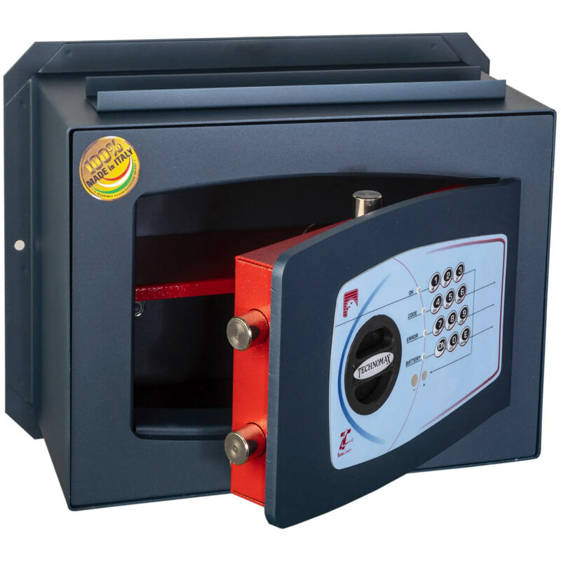 Cassaforte a muro della Technomax, serie “Technobox Trony” modello BGT/4 Cassaforte con apertura a combinazione elettronica digitale Caratteristiche tecniche: Serratura certificata UNI EN 1300 controllata da un congegno elettronico ad alta affidabilità, dotato di memoria permanente. Tastiera a membrana con 4 leds dedicati. Contatti per batteria esterna ricavati direttamente sulla tastiera. Catenacci in acciaio nichelato, girevoli, del Ø di 22 mm. Protezione al meccanismo della serratura con piastra in acciaio al manganese. Speciali battute della porta per una eccezionale resistenza ai tentativi di effrazione con l'uso di una mazza. Ripiano interno. Verniciatura a polvere termoindurente con essiccazione a forno. Spessore frontale e porta 10 mm. A richiesta: Tutti i modelli elettronici possono essere dotati di serratura per un'apertura meccanica di emergenza con chiave di alta sicurezza a doppia mappa (EVO-LOCK). Codice prodotto di questa serie: aggiungere la lettera “P” alla fine del