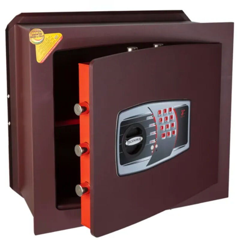Cassaforte a muro “Master Trony” modello TM/6P Il modello “TM/6P” è dotato di serratura per apertura meccanica di emergenza con chiave di alta sicurezza a doppia mappa EVO-LOCK. Caratteristiche tecniche: Serratura certificata UNI EN 1300 controllata da un congegno elettronico ad alta affidabilità, dotato di memoria permanente. Apertura/chiusura con manopola e blocco con elettromagnete. Alimentazione interna con 4 batterie alcaline da 1,5 V. (non incluse). Tastiera a membrana con 4 leds dedicati. Contatti per batteria esterna ricavati direttamente sulla tastiera. Segnalazioni sonore e visive per conferma digitazione, errori e batterie interne in fase di esaurimento. Catenacci in acciaio nichelato, girevoli, del Ø di 22 mm. Protezione al meccanismo della serratura con piastra in acciaio al manganese. Speciali battute della porta per resistere più a lungo ai tentativi di effrazione con mazza. Robuste saldature interne realizzate con sistema robotizzato. Saldatura perimetrale del frontale