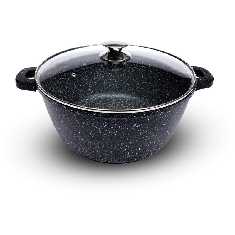 Descrizione Pentola ø 36 cm • Coperchio in vetro di sicurezza, cerchio in acciaio inox • ghisa di alluminio => ideale per la diffusione del calore • Resistente alle alte temperature • Utilizzabile in forno (senza manici) e su tutti i tipi di fornelli. • Lavabile in lavastoviglie • Viene fornito con 2 manici in silicone isolanti, staccabili • Senza PFOA *