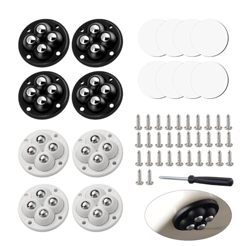 【 Fornitura 】 Il nostro prodotto contiene 8 mini ruote girevoli autoadesive in bianco e nero, che misurano circa 50 x 50 mm. La fornitura comprende anche 8 adesivi, 32 viti e 1 cacciavite. Sia il metodo della colla che il metodo della punzonatura sono adatti per queste rotelle a sfera per mobili.