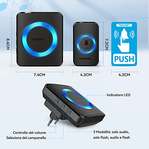 TECKNET Campanello Wireless, Campanello Senza Fili da Esterno Impermeabile, 60 Melodie con 5 Livelli di Volume, Raggio d'Azione 400m(1x Trasmettitore e 1x Ricevitore)
