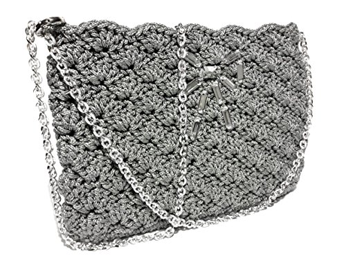 TECLA - Borsetta clutch grigio perla, pochette da sera foderata realizzata a mano con uncinetto, chiusura a calamita
