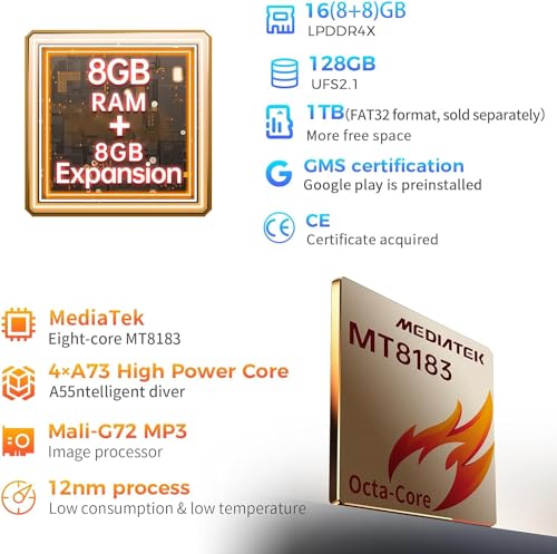 【Prestazioni Elevate】 Tablet Android 12 2023 ad alta capacità con 16GB RAM (8GB RAM + 8GB memoria espandibile). Supporta anche schede microSD fino a 2TB (formato FAT32). Il tablet utilizza la CPU a 8 core "MT8183" di MediaTek, prodotta con un processo a 12 nm a basso consumo, con GPU Mali-G72, dotata di quattro potenti core di architettura A73 a 2,0 GHz per ottenere un basso consumo energetico, una bassa generazione di calore e prestazioni elevate.