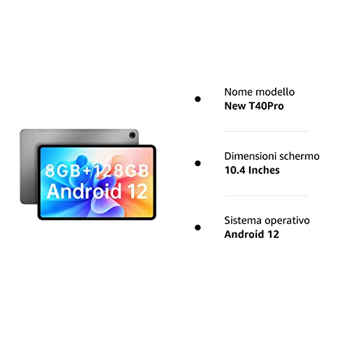 TECLAST 2K Tablet 10.4 Pollici T40 Pro Android 12 Gaming Tablet, 8GB RAM+128GB ROM(TF 1TB), 4G LTE Dual SIM, 2000x1200 IPS TDDI, T616 Octa-Core 2GHz, 4 Speaker/13MP Camera/WiFi/Type-C/GPS/7000mAh-2023