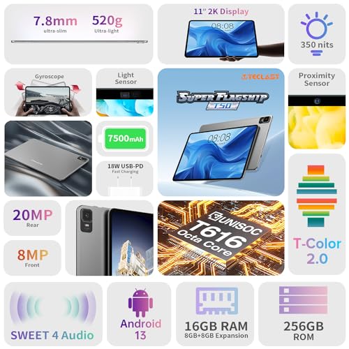 TECLAST 2K Tablet 11 Pollici T50, Android 13 Gaming Tablets, 16GB RAM+256GB ROM(TF 4TB), 4G LTE Dual SIM+5GWiFi, 2000x1200 IPS TDDI, T616 Octa-Core 2GHz CPU, 20MP Camera/BT5/Type-C/GPS/7500mAh-2023