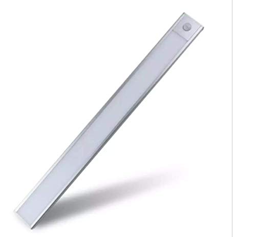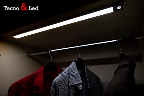 TECNO&LED® Lampada LED batteria ricaricabile con cavo USB, sensore di movimento, luce bianca fredda, Lunga 60 cm, LED integrati 4W, 170Lm, magnetica, sottopensile, armadio, Plastica color argento