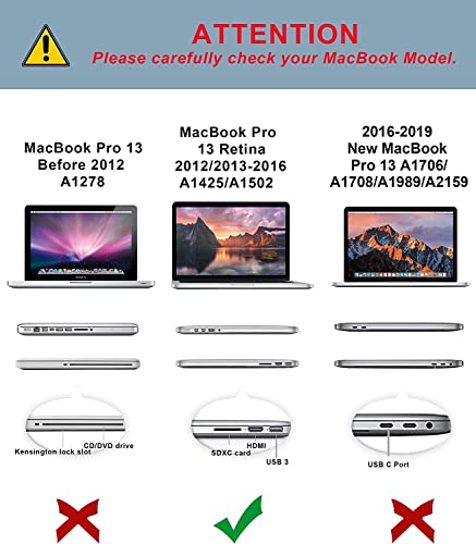 ✔ La custodia compatibile con MacBook Pro 13 pollici Retina (modello A1502 /A1425) rilasciato tra la fine del 2012 e l'inizio del 2015. Il numero di modello "Model A1502" o "Model A1425" si trova nella parte inferiore del MacBook Pro 13.3" Retina.
