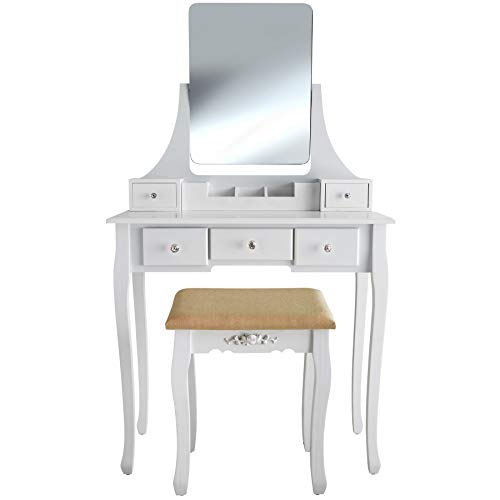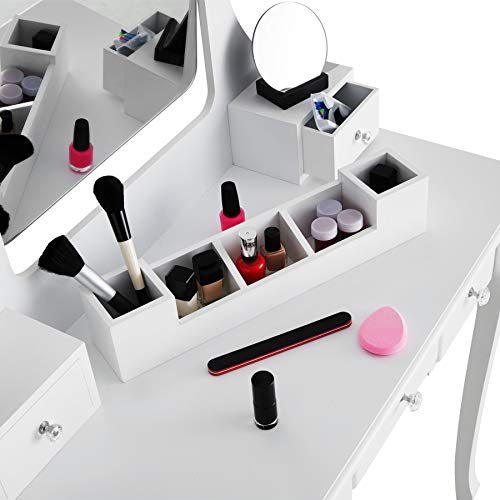 TecTake 403636 Tavolino da Toeletta, Specchio Girevole a 360°, Tavolo da Trucco, 5X Spaziosi Cassetti, Scompartimento Removibile, Sgabello Imbottito