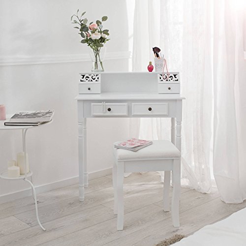 TecTake Tavolino da Trucco con Sgabello Tavolo per Cosmetici comò da toletta Bianco con 4 cassetti