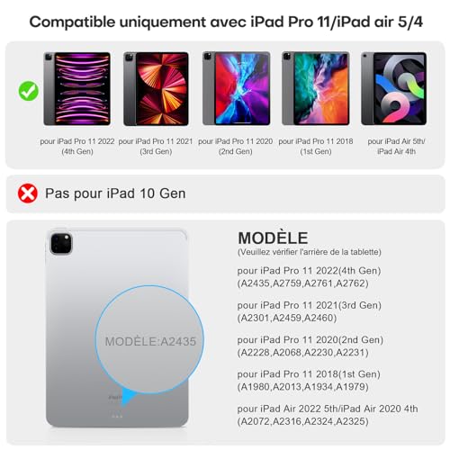 Compatibilità: Questa tastiera per iPad è compatibile solo con iPad Air di quinta generazione (2022)/iPad Air di quarta generazione (2020)/iPad Pro da 11 pollici (2022/2021/2020/2018). Si prega di controllare attentamente il modello nella parte inferiore del vostro iPad prima di effettuare un acquisto. Il numero di modello deve iniziare con Axxxx