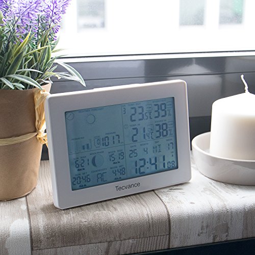 TECVANCE Stazione Metro Digitale con Sensori Esterni, LCD, Radio, Sveglia, Umidità, Temperatura a Batteria con Trasmissione Wireless - Per Parete o Scrivania - 15.7 x 2.6 x 11.2 cm - Bianco