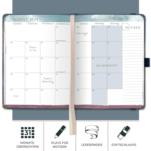 Ha una bellissima copertina, pagine colorate e carta da 100gsm per una scrittura fluida, il agenda planner 2024 rimane piatto da aperto e si chiude con elastico. Con portapenne e tasca per documenti.