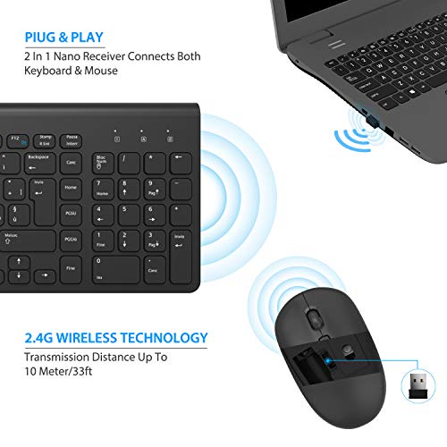 【2.4G TASTIERA E MOUSE WIRELESS 】Questa combinazione di tastiera e mouse full size funziona comodamente. La tecnologia wireless a 2,4 GHz, tastiera e mouse garantisce una connessione stabile e affidabile con una distanza fino a 10 metri. (NOTA: il ricevitore USB è inserito nel vano batteria del mouse. UN nano ricevitore può collegare sia la tastiera che il mouse)