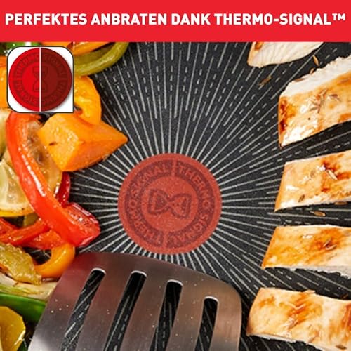 Termostato con indicazione della temperatura. Indica con un cambiamento di colore quando la padella ha raggiunto la temperatura ideale per la frittura e consente risultati perfetti per consistenza, colore e gusto per alimenti deliziosi e fragranti ogni giorno.