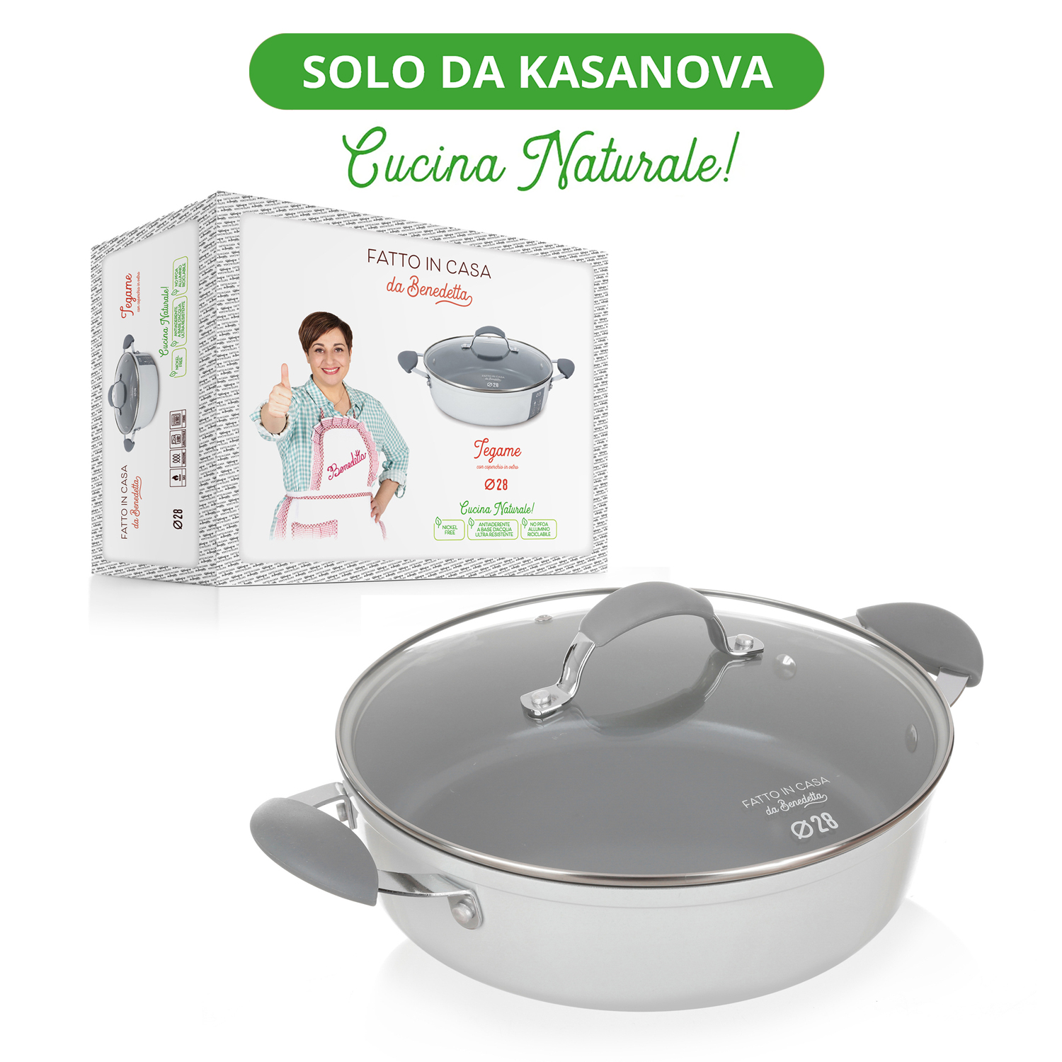 La linea cottura di Benedetta Rossi è perfetta per una cucina naturale, sicura e salutare. Progettata per durare nel tempo, è caratterizzata dal rivestimento antiaderente ceramico a base d'acqua, sano e privo di componenti nocivi. Il rivestimento super liscio consente di cucinare ricette senza grassi, con una croccantezza naturale, e si pulisce facilmente a mano. Il fondo full induction ultrapiatto, che si estende da bordo a bordo, è perfetto per l'induzione perchè aderisce totalmente al piano cottura. Il corpo in alluminio è ideale per una cottura efficiente grazie alla rapida e uniforme distribuzione di calore. Sul lato del tegame e sul coperchio in vetro temperato è applicata una decal con indicazione del diametro che, quando apri il cassetto in cucina, agevola la scelta a colpo d'occhio della pentola da usare e il facile abbinamento del suo coperchio. I manici in silicone lo rendono adatto all'uso in forno fino a 180 °C.