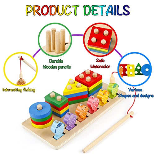 。◕‿◕。【Legno Giochi Educativi Montessori 2 in 1】: Composto da blocchi colorati in 4 forme e 4 colori e da un gioco di pesca in legno, a seconda del numero di fori al centro di ogni forma, i bambini possono impilarli a piacimento, giocattolo in legno della gioco multiplo, impara nel gioco, cresci nel gioco.