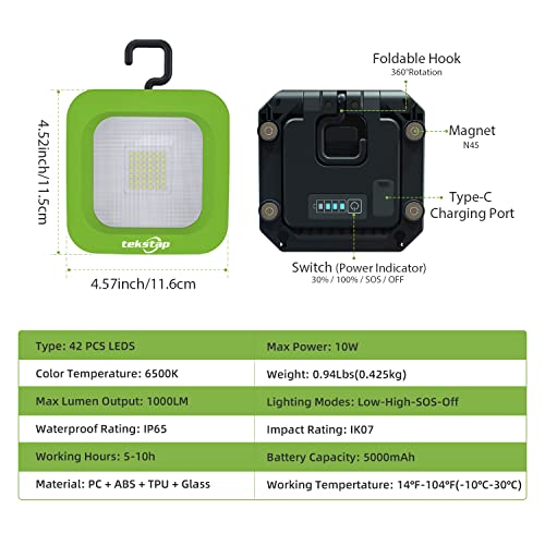 [Luminosità eccellente e 3 modalità di illuminazione] La luce da lavoro portatile Tekstap 10W ha 54 LED con un flusso luminoso di 1000 lumen. Sono disponibili 3 modalità per soddisfare le tue diverse esigenze: bassa luminosità, alta luminosità e modalità di sfarfallio SOS. Funzionamento semplice, l'orario di lavoro continuo in modalità ad alta luminosità (100% di luminosità) è di circa 5 ore e in modalità a bassa luminosità (30% di luminosità) di circa 10 ore.