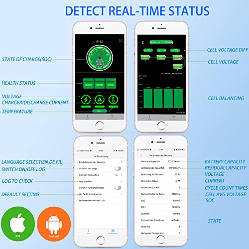Monitoraggio app per smartphone: con il monitoraggio dell'app per smartphone avrete tutti i dati importanti della batteria sempre in tempo reale sul vostro smartphone o tablet. Livello di carica della batteria, tensione, temperatura..