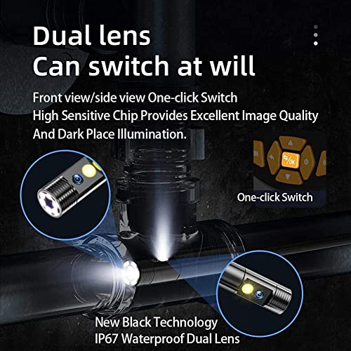 【 endoscopio portatile con doppia fotocamera 】 Il nostro endoscopio utilizza una tecnologia avanzata e integra due lenti. Il design portatile consente di tenere facilmente con una sola mano, mentre la direzione del cavo semirigido viene regolata con l'altra mano. L'angolo di visione di 70° e una fotocamera laterale con un angolo di visione di 70° e consente di accendere la visione anteriore e laterale. Rileva i lati del tubo e cattura più dettagli
