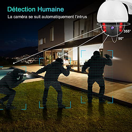 Telecamera wifi esterno, Telecamera di sorveglianza esterno, Telecamera 360 gradi impermeabile -1080P Visione notturna -Segui e rileva umanoidi -Avviso con notifica/email, Scheda SD 64GB incorporata