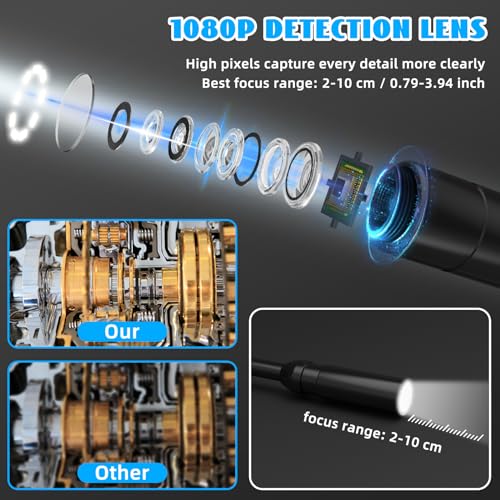 【Fotocamera Snake di Alta Qualità】La telecamera a serpente con design impermeabile IP67 supporta il lavoro sott'acqua.La migliore distanza di messa a fuoco (2 cm-10 cm) facilita le ispezioni. Il cavo semirigido da 5 m (16,5 piedi) consente di piegare arbitrariamente l'endoscopio USB e può raggiungere facilmente varie aree strette e piccole.Batteria ricaricabile da 2000mAh incorporata, dura fino a 3-5 ore.