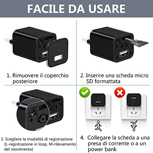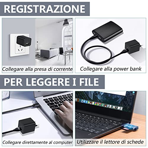 FACILE DA USARE. Questa mini telecamera nascosta è alimentata da una presa di corrente a parete standard o da power bank, il che significa che non dovrai mai preoccuparti della durata della batteria. Dopo aver inserito una micro SD card (NON inclusa) e averla collegata, registrerà automaticamente i video. Nessuna necessità di configurazione, Wi-Fi o app