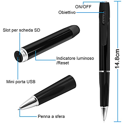 【Telecamera a penna HD 1080p】Questo microcamera genera video e immagini HD a colori 1080p per gli utenti a 30FPS. Fare clic sul pulsante superiore della penna per scattare una foto o registrare un video, sarà automaticamente salvare il video sulla scheda SD (Max supporto 64GB) E non ci sarà alcuna luce durante la registrazione. Si può usare per registrare con fiducia