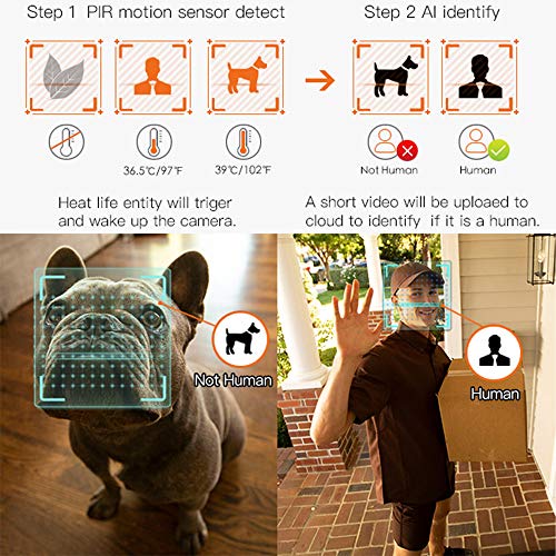 Sensore di movimento PIR integrato e identificazione AI, NIENTE più falsi allarmi causati da pioggia, nevicata o insetti, il sensore di movimento PIR reagisce solo ai mammiferi oa qualsiasi cosa al di sopra della temperatura 97 ° F (36,0 ° C). L'entità Heat life trigerà e riattiverà la fotocamera, un breve video verrà caricato sul cloud per identificare se si tratta di un essere umano, in tal caso, verrà inviata una notifica in tempo reale al telefono.
