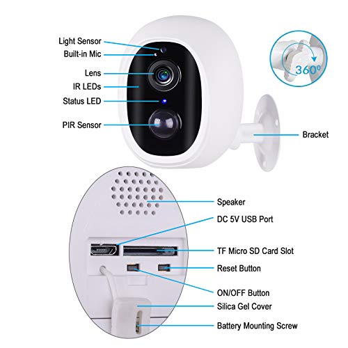 (4) 【Alimentato a batteria o ad energia solare】: la fotocamera ha una lunga durata della batteria con una grande capacità, quindi può anche funzionare bene nonostante l'interruzione di corrente. Puoi anche acquistare separatamente un pannello solare e poi collegarlo alla telecamera WiFi da esterno con batteria, che può realizzare videosorveglianza autosufficiente e indipendente per la tua casa.