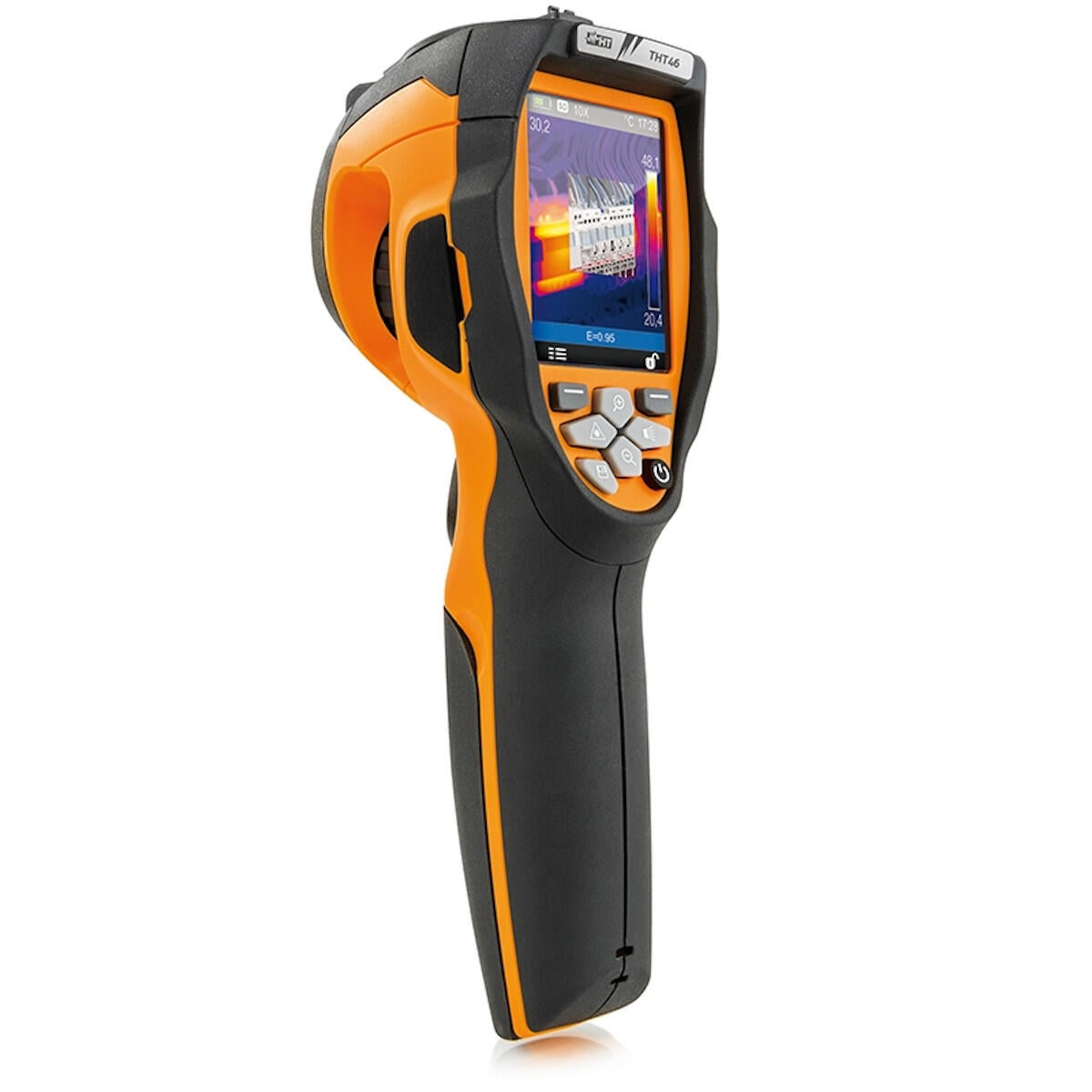 THT46 è dotata di sensore IR con risoluzione 160x120pxl che la rende lo strumento ideale per le operazioni di manutenzione ed analisi quotidiana.. Ideale per la rilevazione di problemi elettrici, controllo di parti meccaniche, analisi di sistemi idraulici, ventilazione forzata, etc. Completa questa termocamera la funzione di SPAN (creazione di una fascia di temperatura di interesse) e quella della impostazione automatica dell'emissività con una tabella preimpostata dei materiali.. La peculiarità dello strumento è caratterizzata da un display LCD a colori ad alta luminosità e da un menù a tendina di estrema semplicità che permettono una facile programmazione tramite l'uso di un tastierino. Lo strumento ha un ampio campo di temperatura (350°C) e salva immagini termiche in formato JPG standard e visive (funzione PiP) all'interno di una micro SD card e può trasferire i dati a PC tramite interfaccia USB. La registrazione di video IR è inoltre disponibile