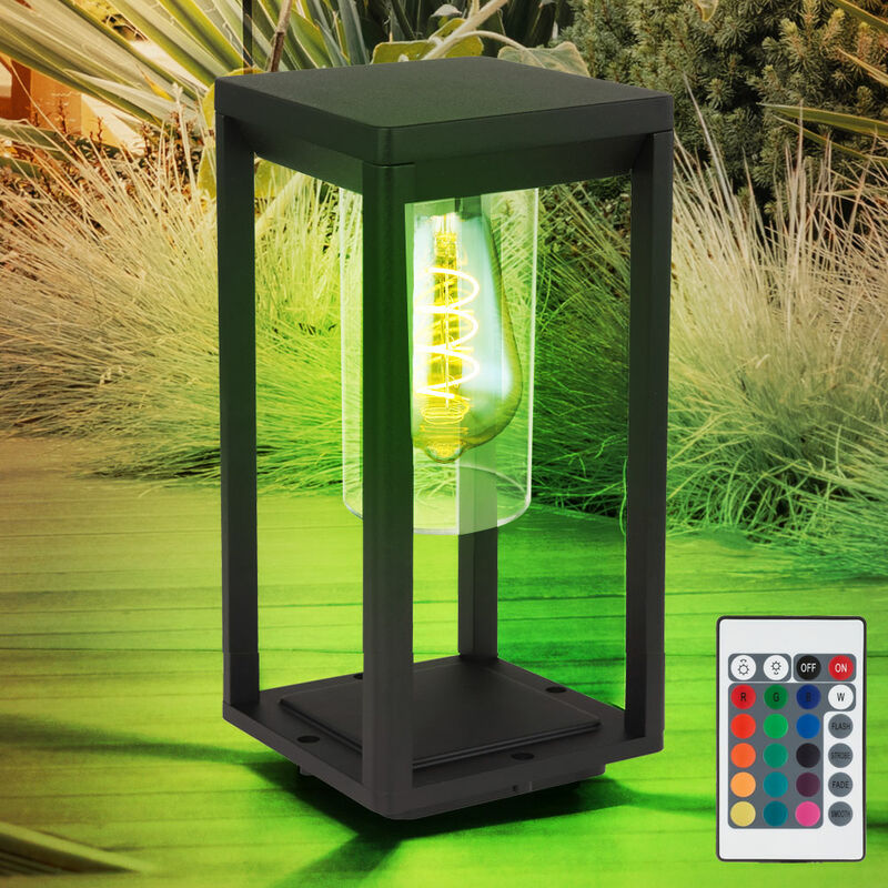 Descrizione Con questa moderna lampada da esterno dal design accattivante, puoi sicuramente abbellire il tuo giardino. Poiché è semplice, nero e la plastica è trasparente, può essere combinato molto bene. Utilizzando il telecomando in dotazione, le lampade LED RGB Set in diversi colori e garantiscono così un'illuminazione d'atmosfera. È inclusa una lampadina LED RGB con telecomando per luce bianca e controllo RGB. Dettagli luce • Tipo di lampada: Lampada da terra• Materiale: Alluminio pressofuso, nero opaco• paralume: plastica, trasparente• classe di protezione: IP44• lunghezza x larghezza x altezza in cm: 15 x 15 x 35 • Attacco: 1x E27• Lampadina inclusa: Sì• Potenza lampada: 1x 9 Watt• Flusso luminoso: 1x 806 Lumen• colore luce: bianco caldo• telecomando: solo per la lampada• voltaggio: 230V, 50Hz Dettagli sorgente luminosa • Sorgente luminosa tipo: RGB-LED • Base: E27 • Materiale: metallo argento, plastica • Colore luce: modalità colore RGB (16 colori selezionabili) • Flusso