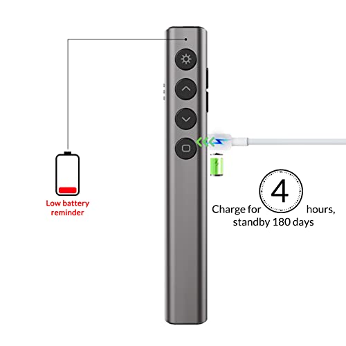 【Ricaricabile e Lunga Portata di Controllo】La batteria ricaricabile integrata da 300 mAh offre settimane di utilizzo con una carica di sole 4 ore. Il puntatore di presentazione è dotato di microchip di alta qualità per garantire una distanza di controllo di 50 metri (165 piedi), che è più lunga rispetto ad altri presentatori di mouse di marca.