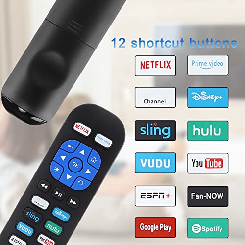 Questo telecomando ha 12 pulsanti di scelta rapida più popolari, come NETFLIX, Prime video, Roku channel, Disney+, sling, hulu, VUDU, YouTube, ESPN+, Fan-NOW, Google Play e Spotify. Puoi scegliere facilmente il tuo canale preferito con questo telecomando. Non è richiesta alcuna configurazione, basta inserire nuove batterie (AAA*2) e il gioco è fatto. Avviso: le batterie NON sono incluse.