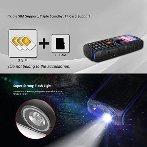 Mulit-Funzione e prestazioni elevate: 3 Sim 3 Standby, Bluetooth 2.0, radio FM, Box Speraker, fotocamera da 2.0MP, torcia a LED, 15 lingue, Power Bank Funtion per caricare altri dispositivi, espansione TF card fino a 8GB (non include)