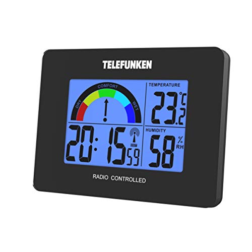 TELEFUNKEN FUD-40COM (B) - Radiosveglia digitale LCD DCF con indicatore di temperatura e del comfort, temperatura interna, umidità dell'aria, termometro, orologio a controllo radio, pannello in vetro acrilico, colore nero
