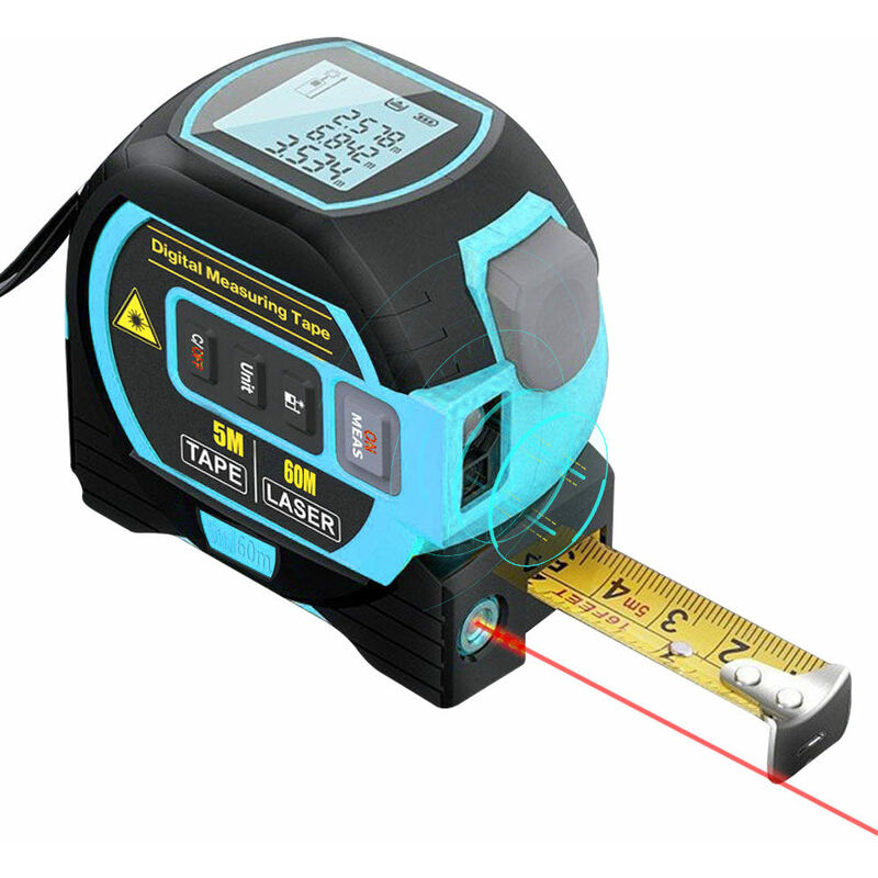 Questo misuratore è un telemetro laser digitale di design 3in1, raggio laser, metro a nastro da 5 m e marcatura laser incrociata, tutto in uno. Ha vari tipi di funzioni di misurazione tra cui misurazione singola/continua, misurazione dell'area, misurazione dei volumi e misurazione pitagorica. Dotato di funzione di memoria dati storici, può contenere max 20 gruppi di dati. Ampie applicazioni, adatte per ingegneria stradale, edilizia abitativa, ingegneria edile, ingegneria per la tutela dell'acqua, ingegneria dell'energia elettrica, ingegneria delle condutture, ecc. Metro a nastro da 5 m e marcatura laser incrociata, tutto in uno. Con elevata elasticità e tenacità dell'alloggiamento in ABS+TPR, resistenza allo scivolamento e alla caduta, efficace protezione dalla polvere, può fornire lunghi tempi di servizio. Display LCD con retroilluminazione, chiara definizione, puoi vedere chiaramente i dati di misurazione anche in ambienti scarsamente illuminati. e scala metrica. Con il dispositivo