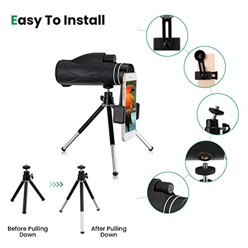 Pacchetto: i monoculari sono dotati dell'ultimo adattatore per cellulare, treppiede, panno per la pulizia, borsa telescopica e istruzioni per l'uso. Avrai le mani libere quando usi il telescopio e puoi osservarlo posizionandolo su un treppiede. Perfetto per quasi tutti gli smartphone sul mercato. Facile da installare, condividi i tuoi momenti belli e meravigliosi con la tua famiglia e gli amici.