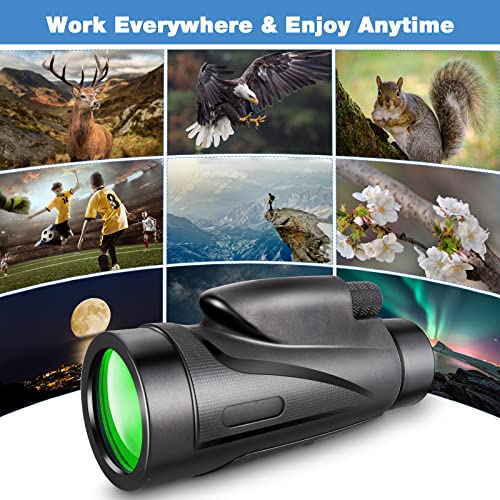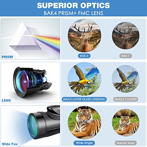 [Prisma BAK 4 e visione notturna] Questo monocular telescope lunga distanza è progettato con prisma BAK 4 e lenti completamente rivestite, garantisce una trasmissione della luce e una luminosità superiori. La trasmissione della luce raggiunge il 99,5% di visibilità. Grazie alla funzione di visione notturna ridotta, puoi vedere chiaramente gli obiettivi anche nella scena buia