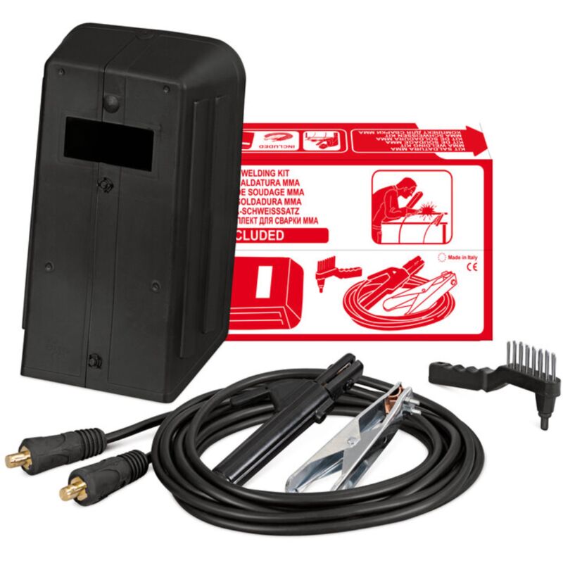 Composizione: cavo 10 mmq 2 m dinse 25, cavo 10 mmq 3 m dinse 25, pinza porta elettrodo, spazzola, maschera, pinza di massa 250A, vetro filtro mm 51x108.