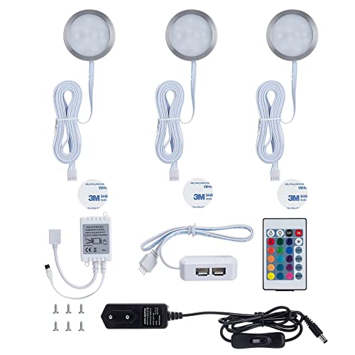 Temgin Set di 3 Lampada Armadio RGB Dimmerabile Rotonde Luce Armadio Cucina Alluminio Luce Notte per Comodino Corridoio Dentro a Cassetti e Pensili 12V DC (Senza Batteria)