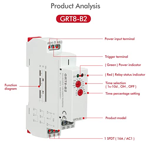 Relè di temporizzazione, GRT8-B2 Relè di temporizzazione su guida DIN Mini Single Function Control AC/DC 12v-240v Relè di temporizzazione multifunzione per controllo a funzione singola(AC/DC12V-240V)