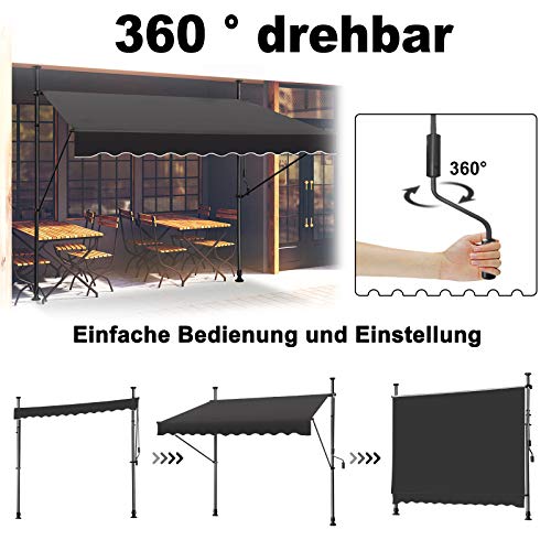 LZQ Tenda da sole per balcone, retrattile manuale, manovella, regolabile in altezza, resistente ai raggi UV, senza foratura, 100% poliestere, grigio scuro, 350 x 120 cm