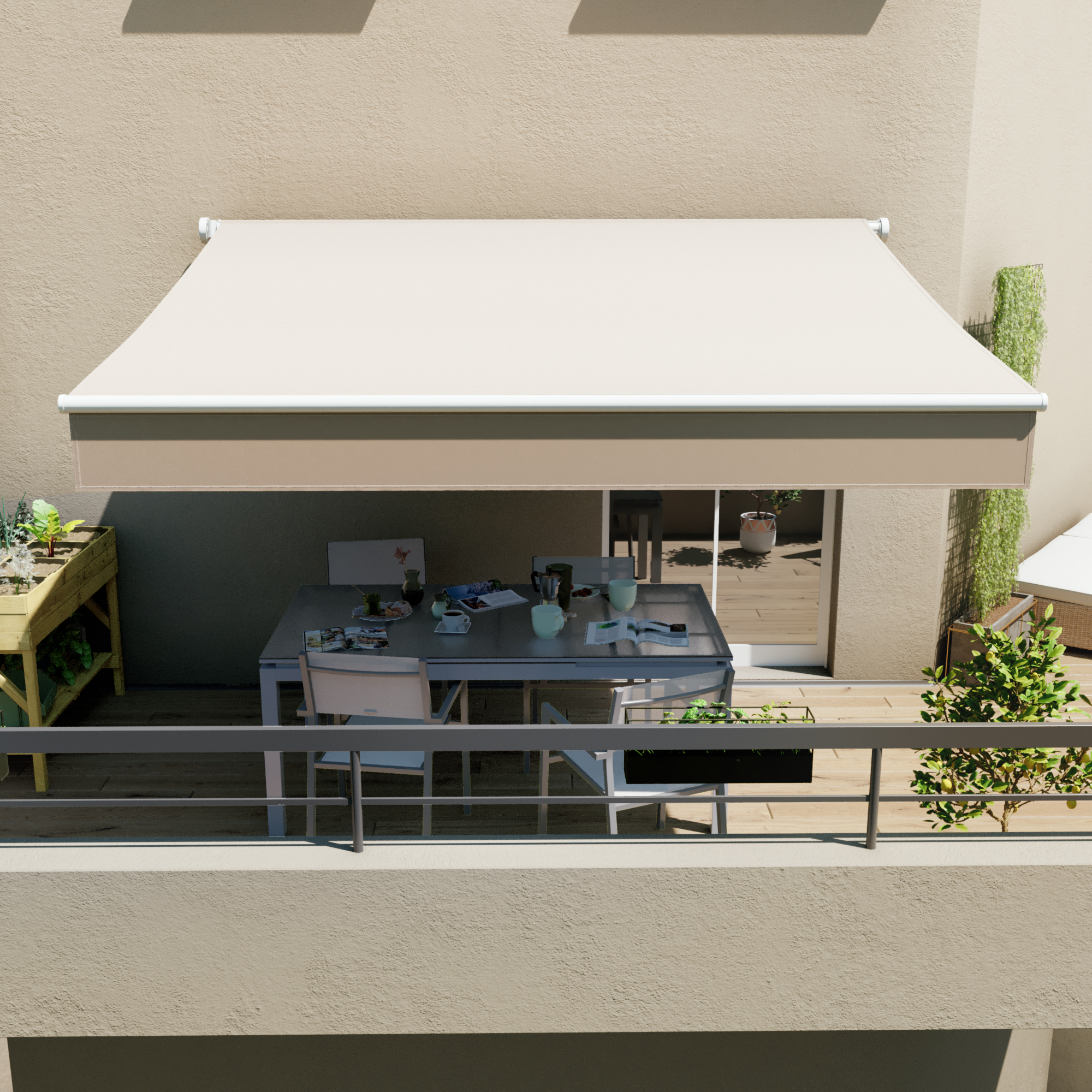 Questa tenda da sole manuale 3x2 metri crea uno spazio di vita all'aperto che ti consente di godere appieno della tua terrazza proteggendoti dal sole. Ha una tela di poliestere adatta all'esposizione al sole per alcune settimane all'anno. In caso di pioggia moderata, il telo lascia scorrere l'acqua senza penetrarla. Dotata di barra di torsione che offre una migliore resistenza, questa tenda da sole può essere installata a parete o a soffitto tramite staffe vendute separatamente. Questa tenda CALIMA è dotata di una manovella ed è facile da installare.